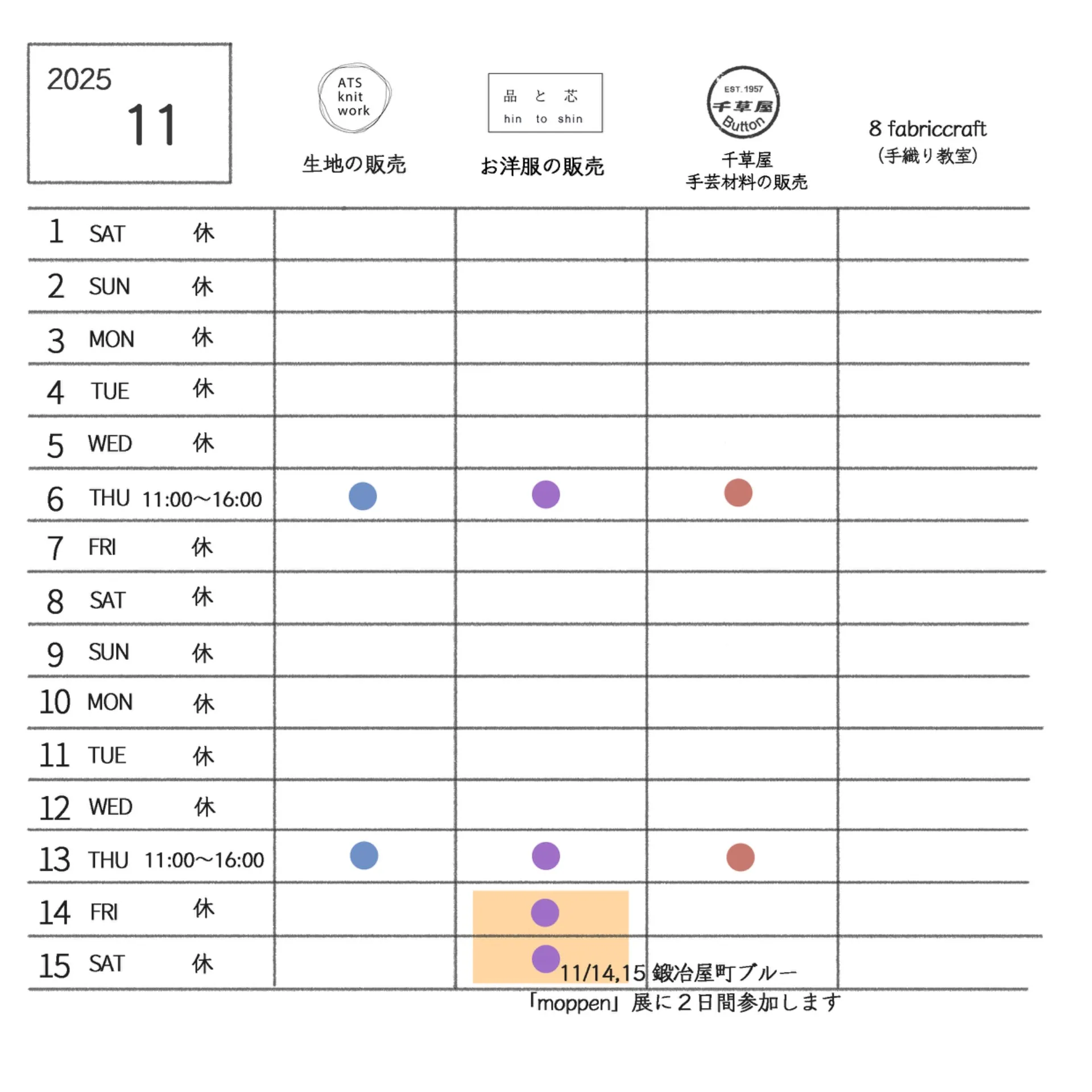 『moppen』 at鍛冶屋町ブルー(11/8〜16開催)の内、2日間出店させて頂きます!