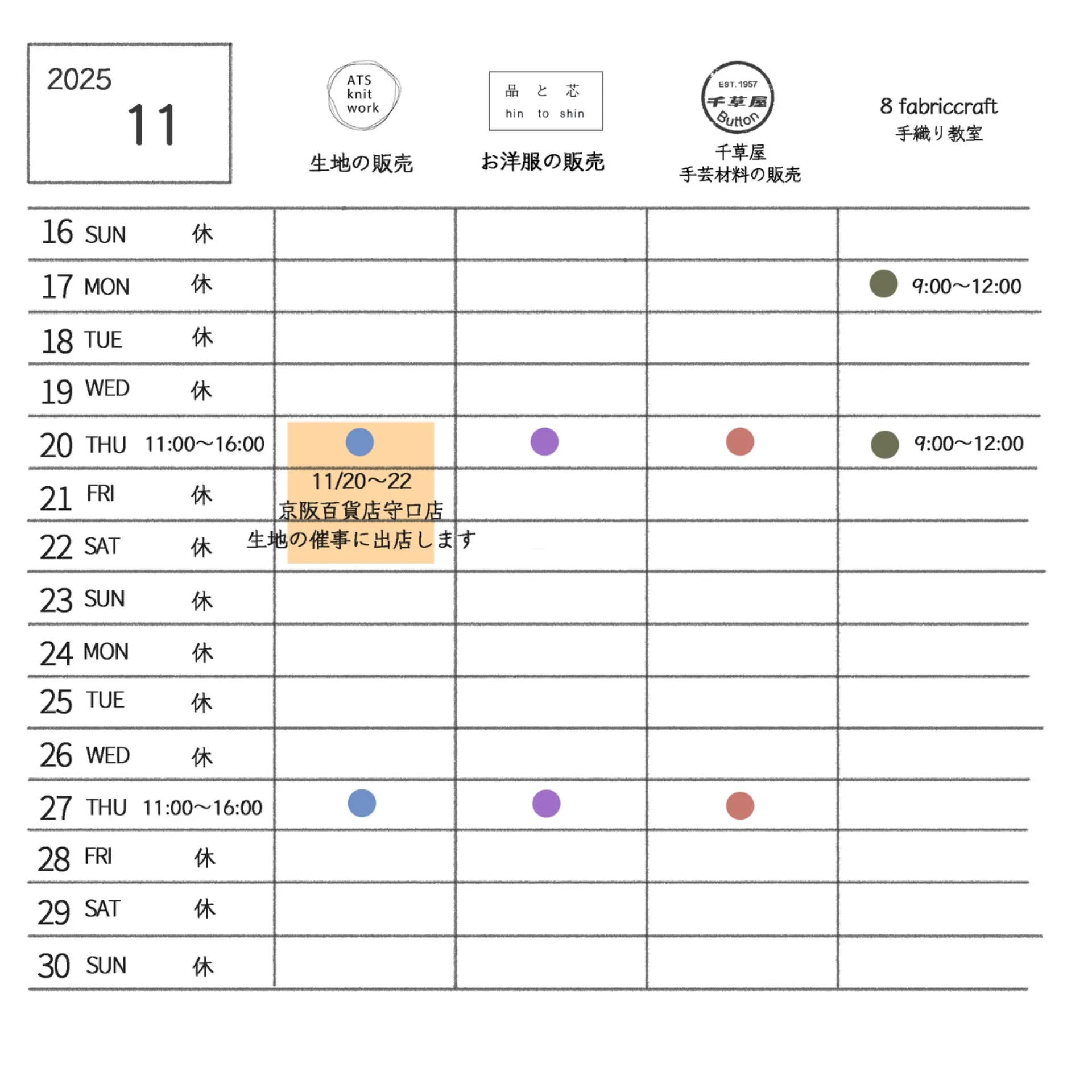 ☆2025年11月 倉庫店舗営業日のお知らせ☆